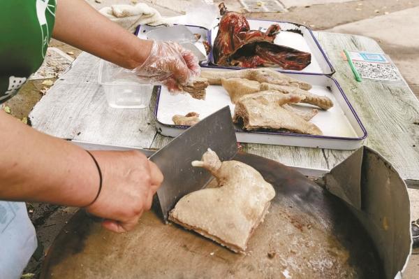 陈世英的摊位就卖烧鹅和白斩鹅,其中,烧鹅是从大沙泥街的烧鹅店进的货,白斩鹅是陈世英自己杀自己做的。“白斩鹅的原料很重要,要选择本地的鹅,煮的过程中不放任何佐料,需要煮一个多小时。”她边说边比划,还笑着提起第一次宰鹅时被“诈尸”的鹅吓得一激灵,后来她还经常拿这事吓唬年幼的女儿。
