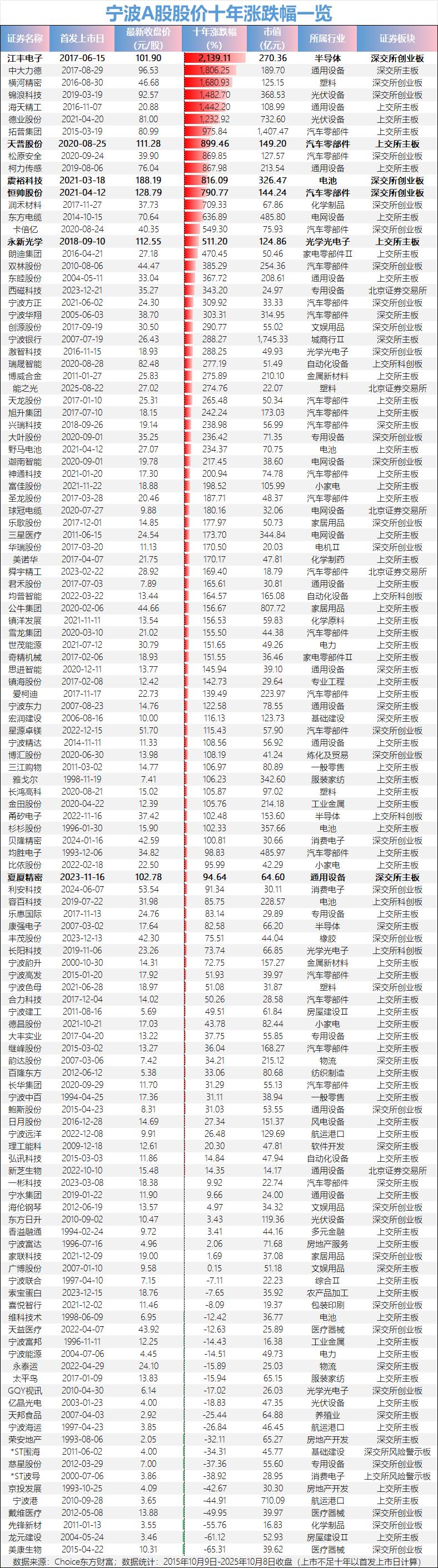十年来,超八成甬股股价上涨(上市不足十年以首发上市日计算,下同),江丰电子(2139.11%)、中大力德(1806.25%)、横河精密(1680.93%)、锦浪科技(1482.70%)、海天精工(1442.40%)、德业股份(1232.92%)等涨幅超10倍。