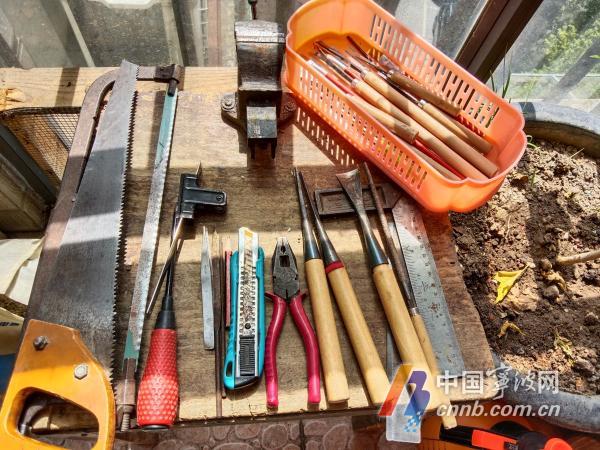工具架上,锯子、凿子、刻刀等摆得整整齐齐,数一数竟有30多件。