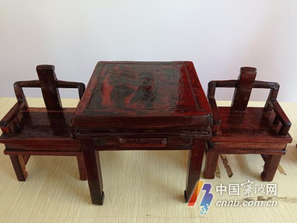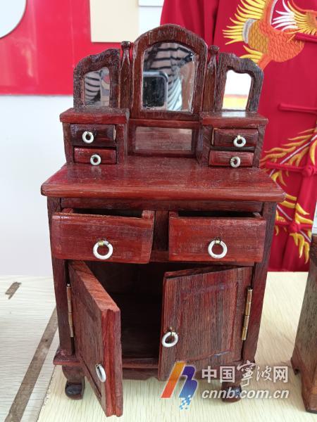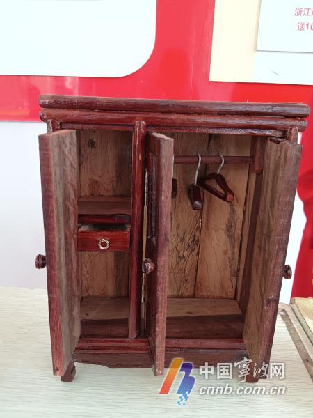 这些作品中,有复刻老宁波生活的三门大衣橱、樟木箱、化妆桌、老式雕花木床,也有实用的笔筒、木盒,还有小巧的木质玩具。
