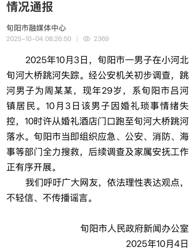 近日,陕西旬阳市男子周某某在婚礼当天跳河的事件引发关注。连日来,旬阳市组织应急、公安、消防、海事等部门全力搜救。