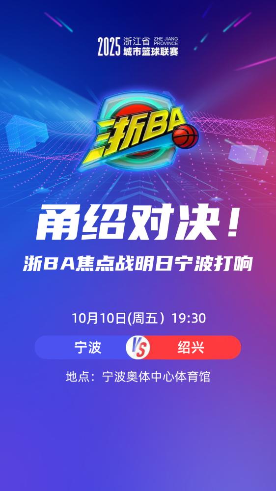 明日(10月10日)19:30,宁波奥体中心体育馆将迎来2025浙江省城市篮球联赛(“浙BA”)B组焦点对决——宁波队坐镇主场,迎战绍兴队。