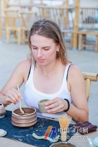 在宋韵点茶体验中,塔格尔与弗鲁维尔托娃在河畔古树下聆听水声、细品茶香,两人对中式“拉花”技艺表现出了浓厚的兴趣。