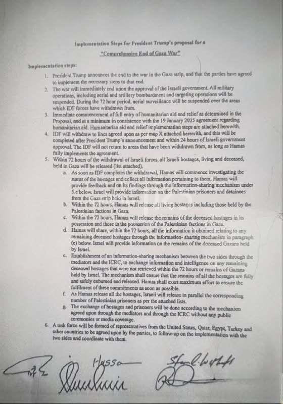 当地时间9日夜间,以色列公共广播公司Kan发布了以色列、哈马斯和调解员在埃及签署的释放被扣押人员和结束加沙冲突的协议副本。这份文件详细介绍了该协议的各个部分。