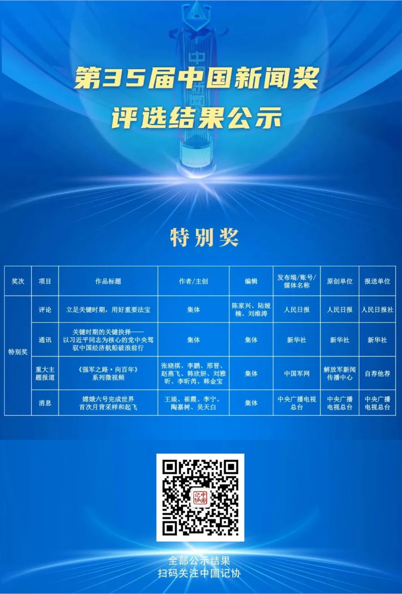 由中华全国新闻工作者协会(简称“中国记协”)主办的第35届中国新闻奖评选结果自今日起在中国记协微信公众号、中国记协网公示。本届拟获奖作品379件,其中特别奖4件、一等奖75件、二等奖113件、三等奖187件。