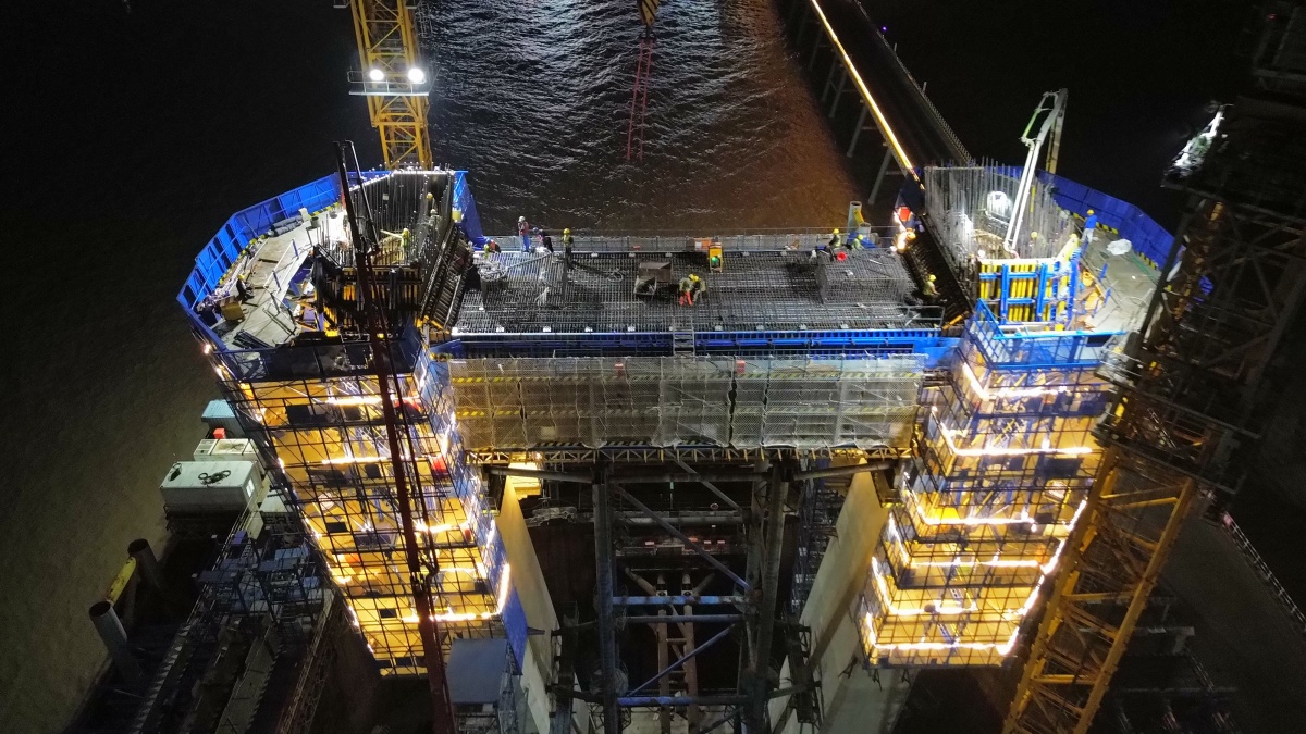 此次施工的主塔下塔柱与中塔柱交界处的下横梁,是主塔关键受力构件,其作用如同“挑山工的扁担”,未来将直接承载铁路桥面,并将列车运行的巨大荷载传递至塔身与基础。