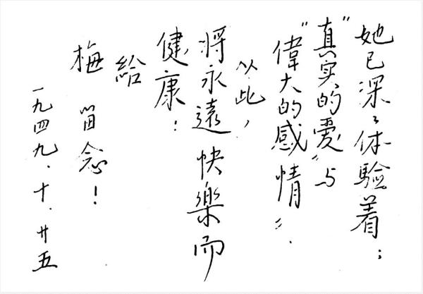 她在给家人的信中写道:“我也常想念你们,只要脑子一有空,无论在船上、在车里,或在夜深人静时,都会念念不已……几年来,我彻底体验到‘人非木石’这句话的真义。”
