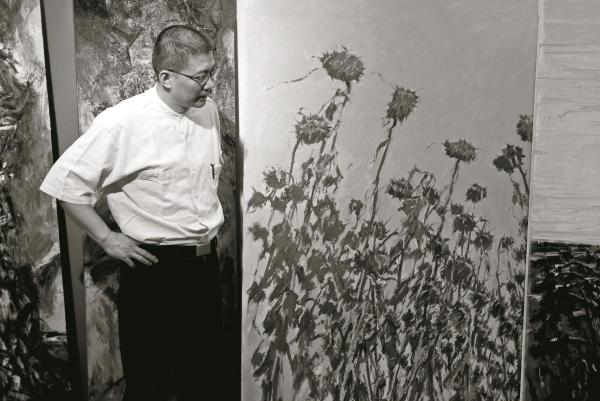 另一种是四周墙上的大型葵园绘画,这种大尺度的作品并不常见。宁波美术馆里有一面王澍设计的铁墙,不少艺术家觉得难以回应钢铁的质感,但我的绘画刚好能与它契合——钢铁的大背景成了画作的底色,我用大尺度的画面、群体的葵、复数的葵,让每幅画上都有几百个葵,它们像几百张不同的面孔,共同组成了史诗般的画面。