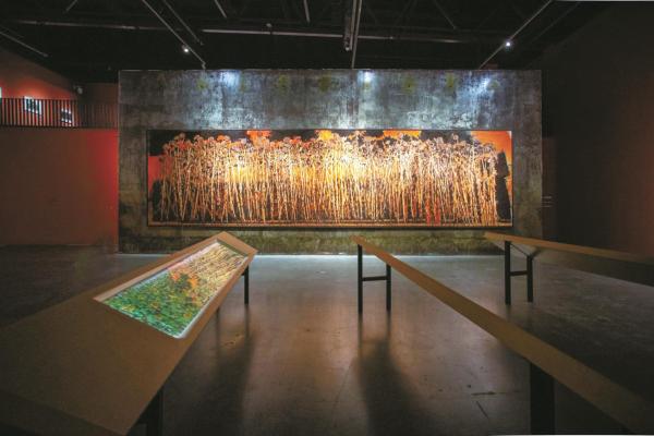 一种是平面铺展式——通常画作都是挂在墙上让人欣赏的,而这种像读长卷、面对阅览桌一样的铺展方式,是我的独创,且坚持了很多年。这次展览的灯光设计格外用心,切片灯光正好勾勒出每幅画的形状,大家能清晰看到冬天的雪葵、秋天的秋葵、夏日生生不息的夏葵,还有被台风吹过、宛如剧场般的葵园景象。