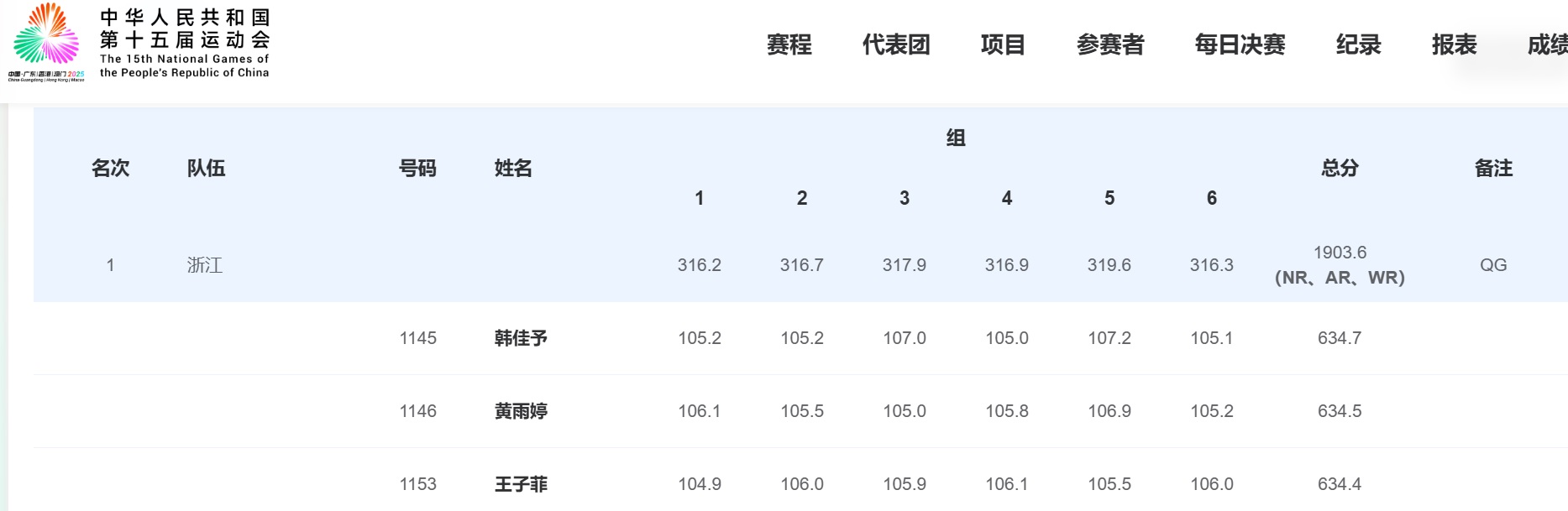 13日,在第十五届全国运动会女子10米气步枪资格赛中,由王子菲、黄雨婷、韩佳予组成的浙江队打出了1903.6环的总成绩,超过了中国队在2025年射击亚锦赛中创造的1902.0环的团体世界纪录。