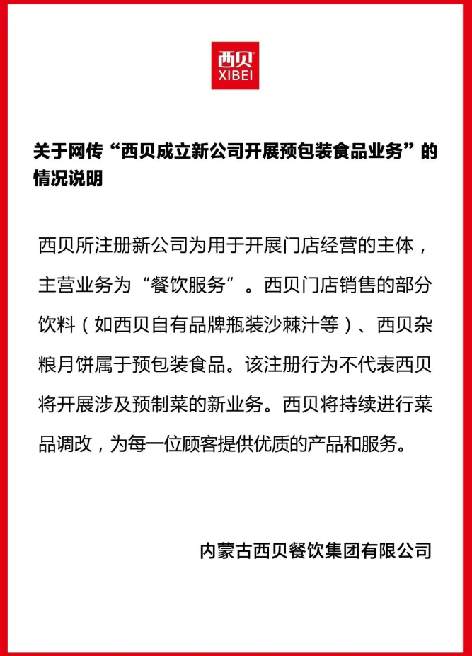 10月13日,西贝集团发布的关于网传“西贝成立新公司开展预包装食品业务”的情况说明指出,西贝所注册新公司为用于开展门店经营的主体主营业务为“餐饮服务”。西贝门店销售的部分饮料(如西贝自有品牌瓶装沙棘汁等)、西贝杂粮月饼属于预包装食品。该注册行为不代表西贝将开展涉及预制菜的新业务。西贝将持续进行菜品调改,为每一位顾客提供优质的产品和服务。