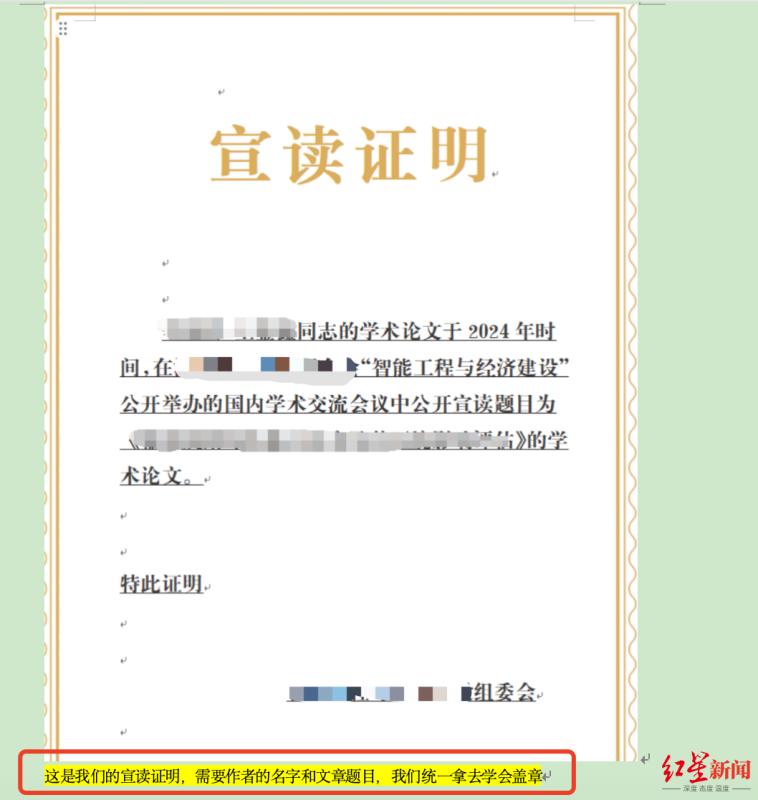 在该机构提供的内部培训材料中,红星新闻记者看到,一张个人信息被打上马赛克的《宣读证明》显示,某人的学术论文已在一场学术会议上进行公开宣读,下方落款处也写着某组委会。而该证明下方批注写着:“这是我们的宣读证明,需作者名字和文章题目,我们统一拿去学会盖章。”