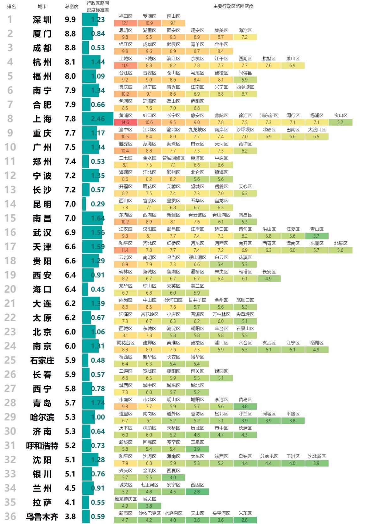 从全国范围看,36个主要城市平均道路网密度为6.6公里/平方公里,呈现出“粤港澳大湾区>长三角>京津冀”的特征。