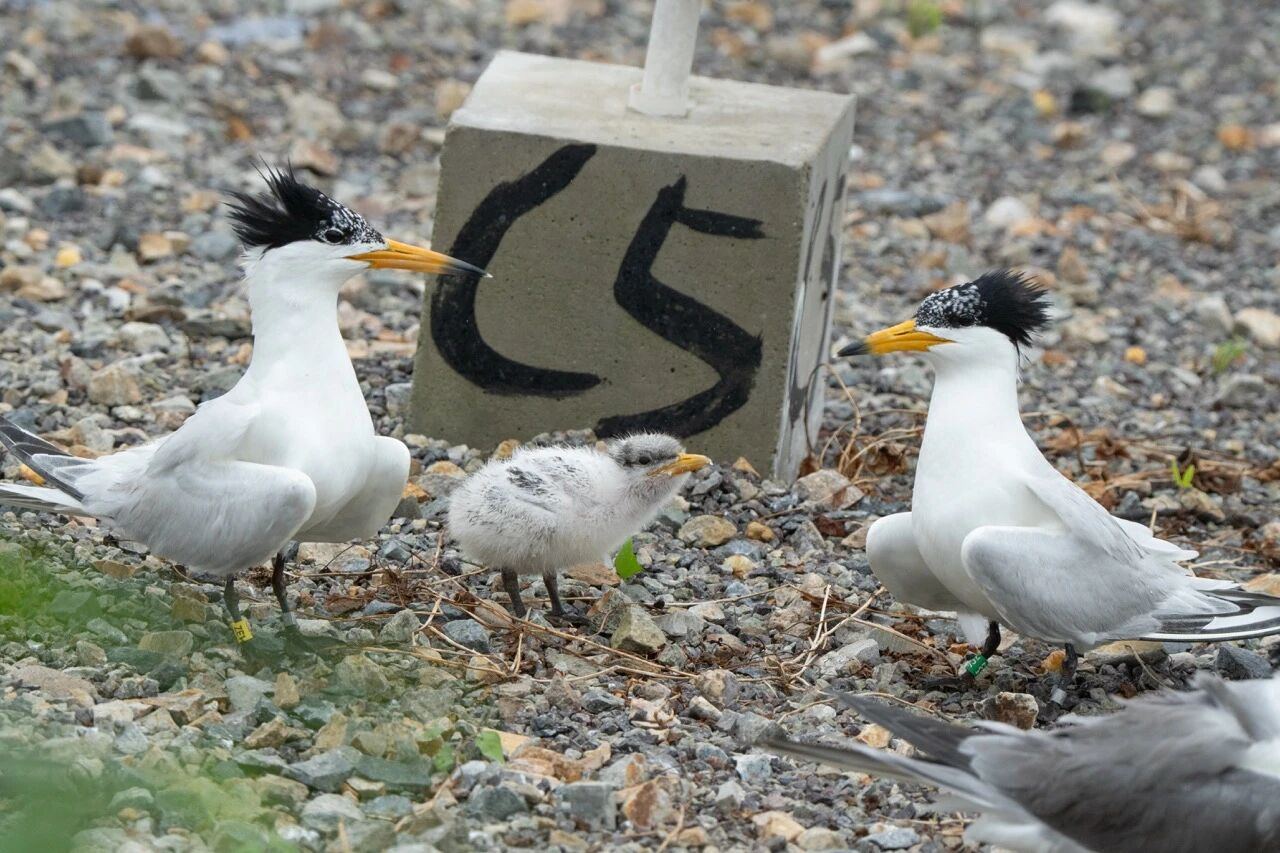 南麂平峙岛2025年第1只中华凤头燕鸥幼崽及其亲鸟 图源:保护神话之鸟微信公众号