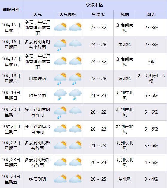 真正的天气转折出现在18日后,届时一股实力强劲的冷空气将带来明显降温、降水和大风天气过程,沿海海面风力将逐渐增强至9-10级。此后气温将持续走低,下周最高气温将跌破24℃,最低气温徘徊在20℃上下,宁波人期待已久的“秋凉”终于要来了。
