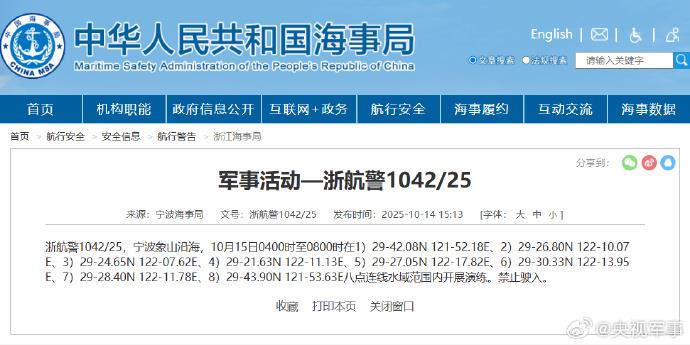 据中国海事局网站消息,宁波海事局发布航行警告,10月15日4时至8时、10月15日6时至12时,宁波象山沿海进行军事演练,禁止驶入。