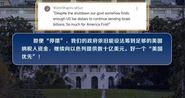 还有网友讽刺道:即便“停摆”,我们的政府依旧能设法筹到足够的美国纳税人资金,继续向以色列提供数十亿美元。好一个“美国优先”!