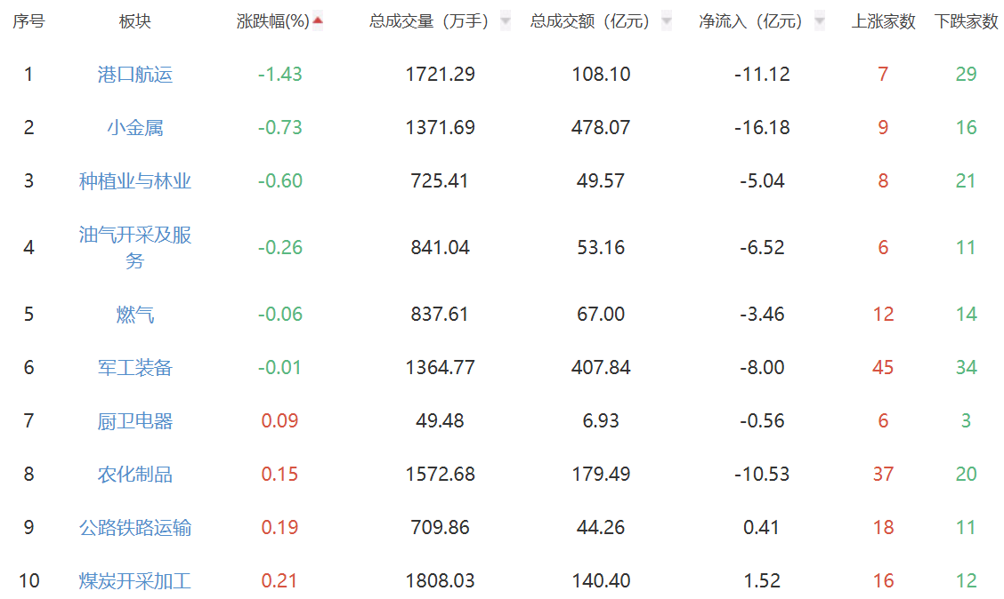 板块方面,汽车整车、机场航运、电网设备等板块涨幅居前,港口航运、小金属、种植业与林业等板块跌幅居前。