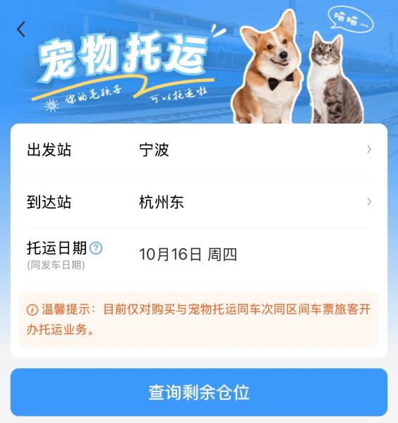 10月15日起,铁路宁波站上线“宠物托运”服务,旅客可通过铁路12306APP进行预约,为符合条件的宠物办理同车托运。允许托运的宠物限于家庭驯养的猫或犬,要求健康状况良好,且单只体重不超过15公斤、肩高不超过40厘米。