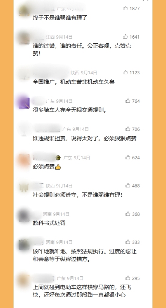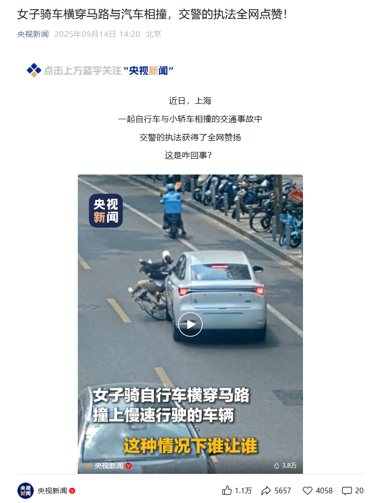 前不久,央视新闻发布的《女子骑车横穿马路与汽车相撞,交警的执法全网点赞!》一文引起广泛关注。记者梳理评论发现,网友们意见很一致:“谁违规谁担责,不是‘谁弱谁有理’!”……