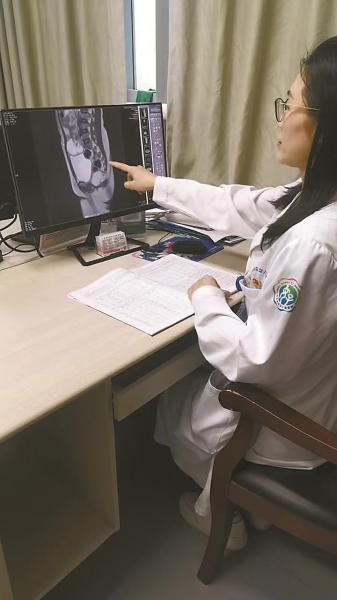 支医生仔细查看患儿腹部磁共振影像。