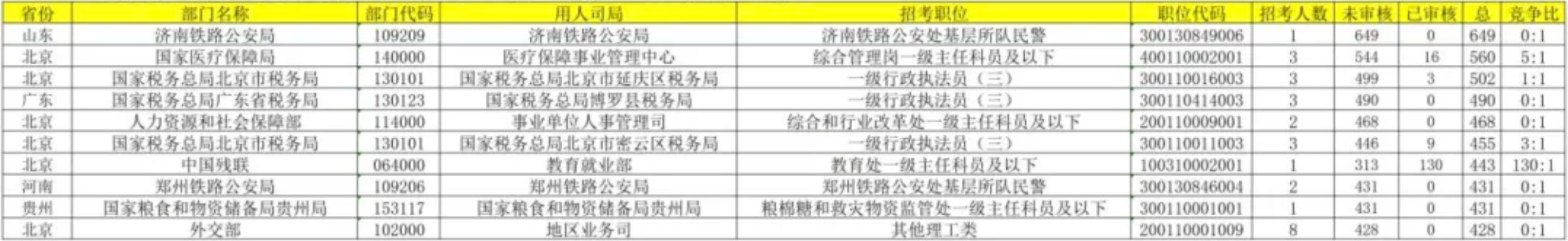 从表格数据来看,国考热门岗位分布较广,山东、北京、广东等地均有岗位入围。山东济南铁路公安局基层所队民警岗位,招考1人,未审核数达649,总报名数649,可见竞争十分激烈。