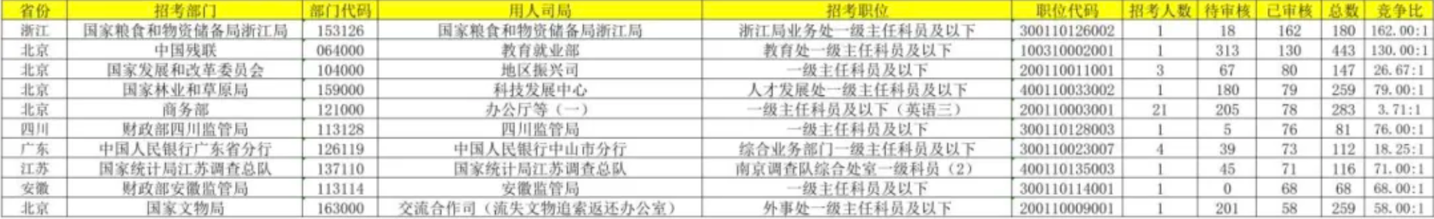 从表格呈现的国考岗位竞争数据来看,不同地区、部门的岗位竞争热度差异明显。位于浙江省的国家粮食和物资储备局浙江局的相关岗位竞争比高达162:1,位居第一;位于北京的中国残联教育就业部竞争比紧随其后,竞争比达130:1。而四川、江苏、安徽等地部分岗位竞争比相对稍缓,但也都超过了50:1。