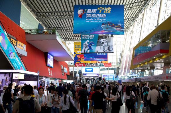 “品质宁波 智造创新”的标语高挂展馆。赵煜 摄