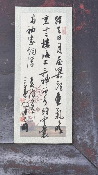 内容:“经天日月屋梁头,蜃气晴熏十二楼。海上三神曾有约,云囊两袖紫烟浮”,落款:“古贤诗一首,三合堂主人陆爱国”。