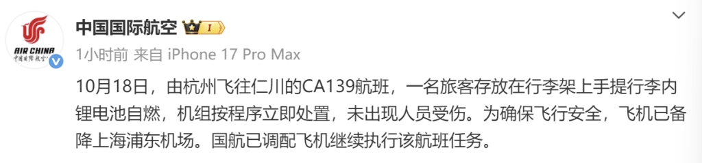 18日中午12时许,中国国际航空官方微博发文称:10月18日,由杭州飞往仁川的CA139航班,一名旅客存放在行李架上手提行李内锂电池自燃,机组按程序立即处置,未出现人员受伤。为确保飞行安全,飞机已备降上海浦东机场。国航已调配飞机继续执行该航班任务。