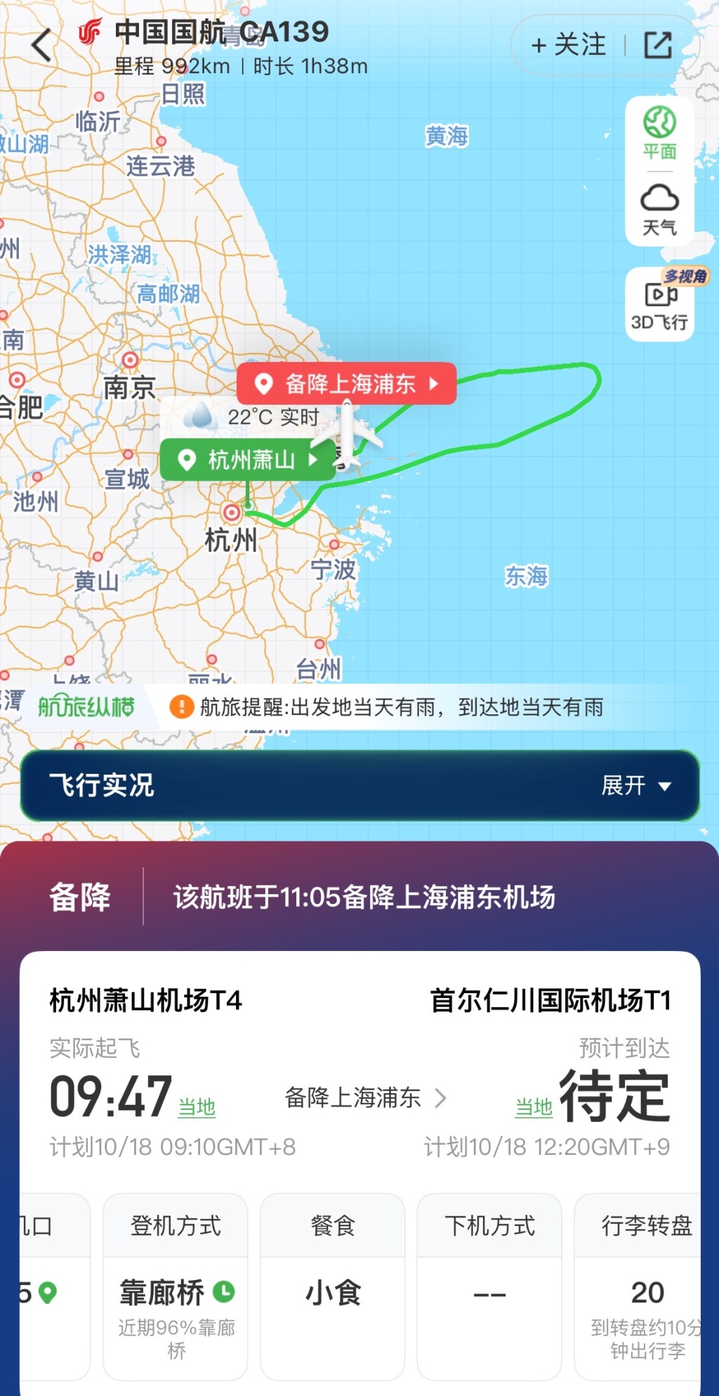 澎湃新闻记者注意到,航旅纵横APP显示,该航班本计划于12时20分抵达韩国仁川机场,于11时05分备降上海浦东机场。