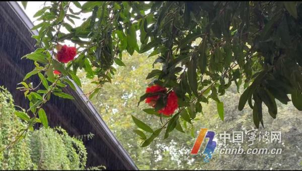 10月18日,南塘老街,雨水中的红花绿叶。记者 石承承 摄