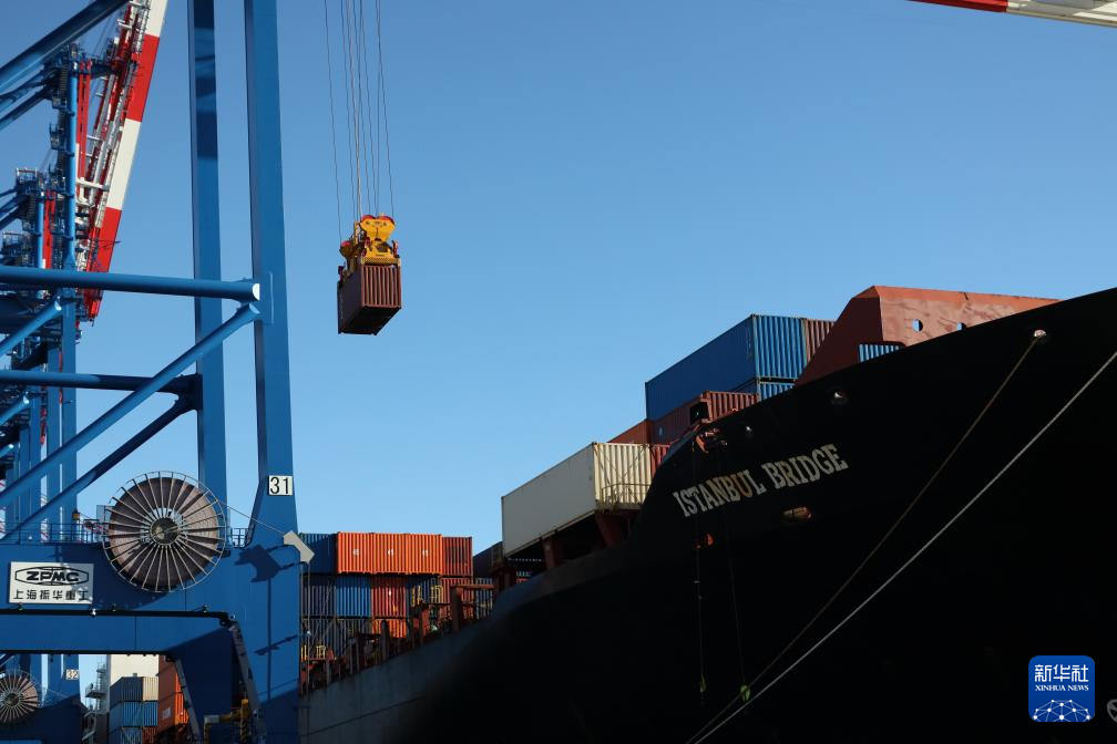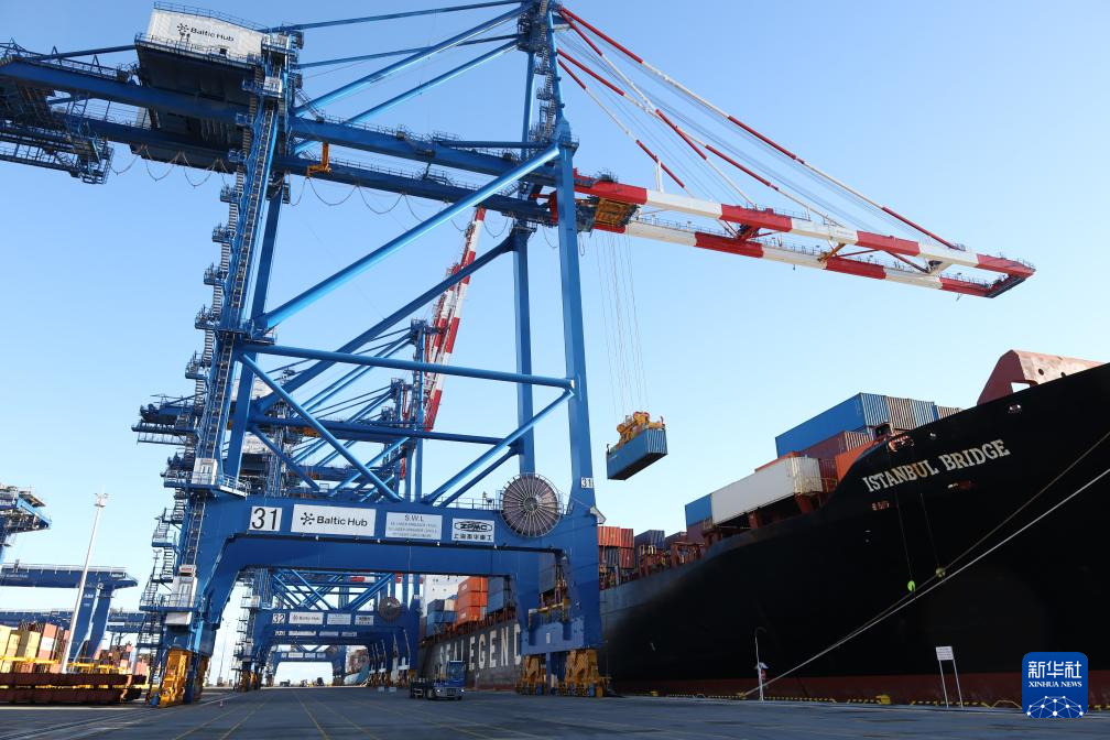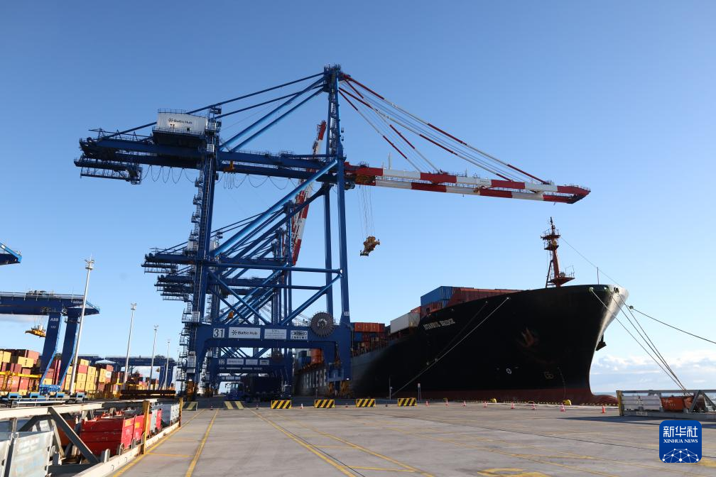 10月19日,在波兰北部格但斯克港,从中国宁波舟山港出发的中欧北极快航航线首艘货船进行装卸工作。新华社记者崔力摄