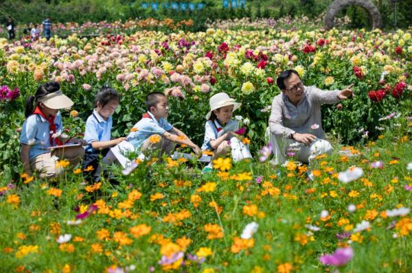 儿童文学作家、诗人雪野带领学生在田野写诗。