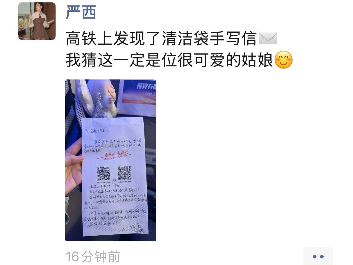 10月20日,宁波市民严女士在高铁上意外发现一封写在清洁袋上的手写信,这封信来自一位首次到访浙江的长沙旅客,信中表达了对宁波之旅的期待与紧张,并写下“来宁波追寻自己的幸福”的愿望。