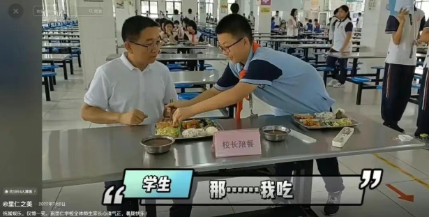 校长苗本臣此前受到网络关注走红,源于一段三年前的娱乐视频。2022年7月,里仁学校发布的一段苗本臣在陪餐时被学生“抢”了鸡排和粽子的视频。