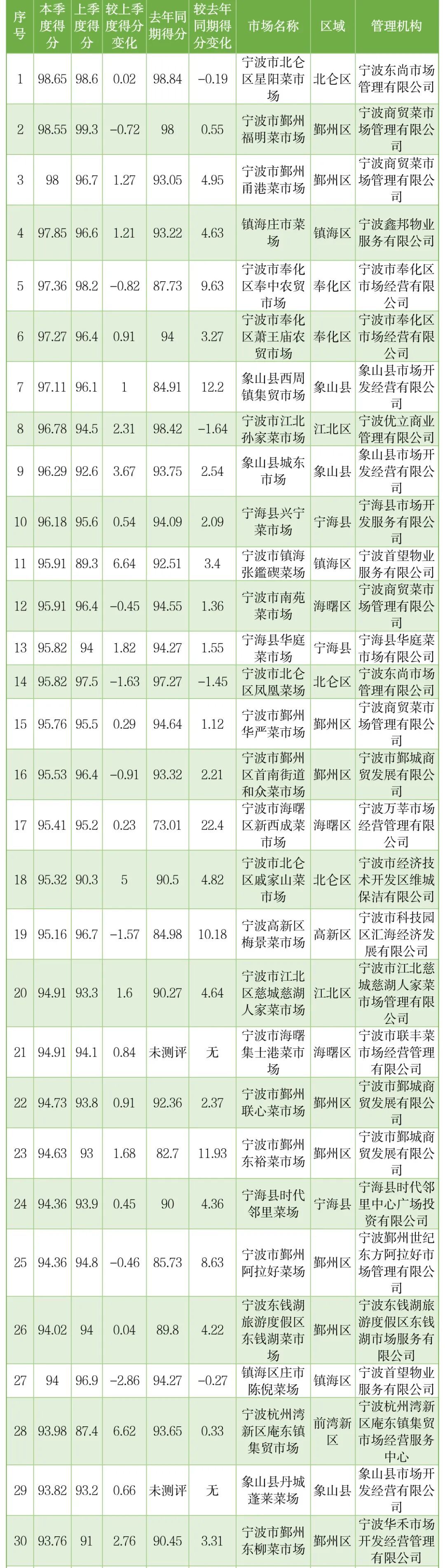 得分居前三的管理机构分别为宁波商贸菜市场管理有限公司(96.32分)、宁波市鄞城商贸发展有限公司(94.21分)、宁波东钱湖旅游度假区东钱湖市场服务有限公司(92.71分)。