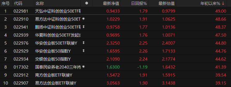 其中,天弘中证科创创业50ETF联接Y以49%的年内涨幅领跑;易方达中证科创创业50ETF联接Y、鹏扬中证科创创业50ETF联接Y、华夏中证科创创业50ETF联接Y紧随其后,年内涨幅均超45%;合计有19只产品年内业绩回报均超30%。