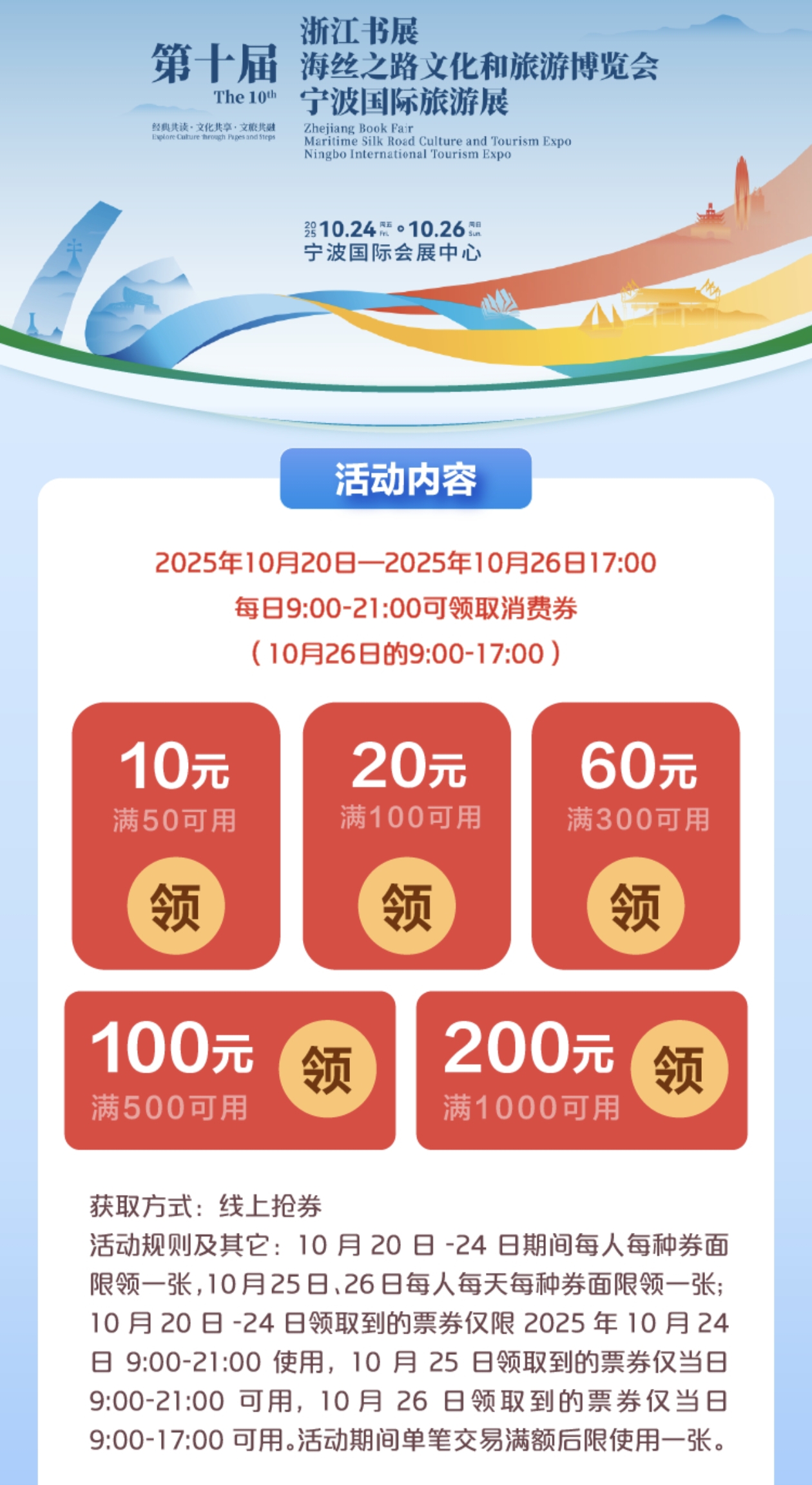 领取方式:消费者可通过“云闪付App”首页—【市县消费券】—【文化消费券】活动专区页面,在规定时间内点击抢券。抢券采取先到先得方式,10月20日至24日每人每种券面限领一张,25日至26日每人每天每种券面限领一张,每轮消费券领完即止。