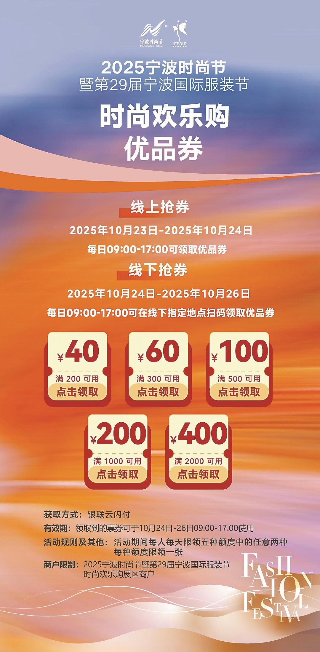 本次发放的“优品券”采用满减抵扣方式,共设有5种面额:满200元减40元、满300元减60元、满500元减100元、满1000元减200元、满2000元减400元。活动期间,单笔交易满额后限使用一张,核销范围为2025宁波时尚节-“时尚欢乐购”展区的商户。