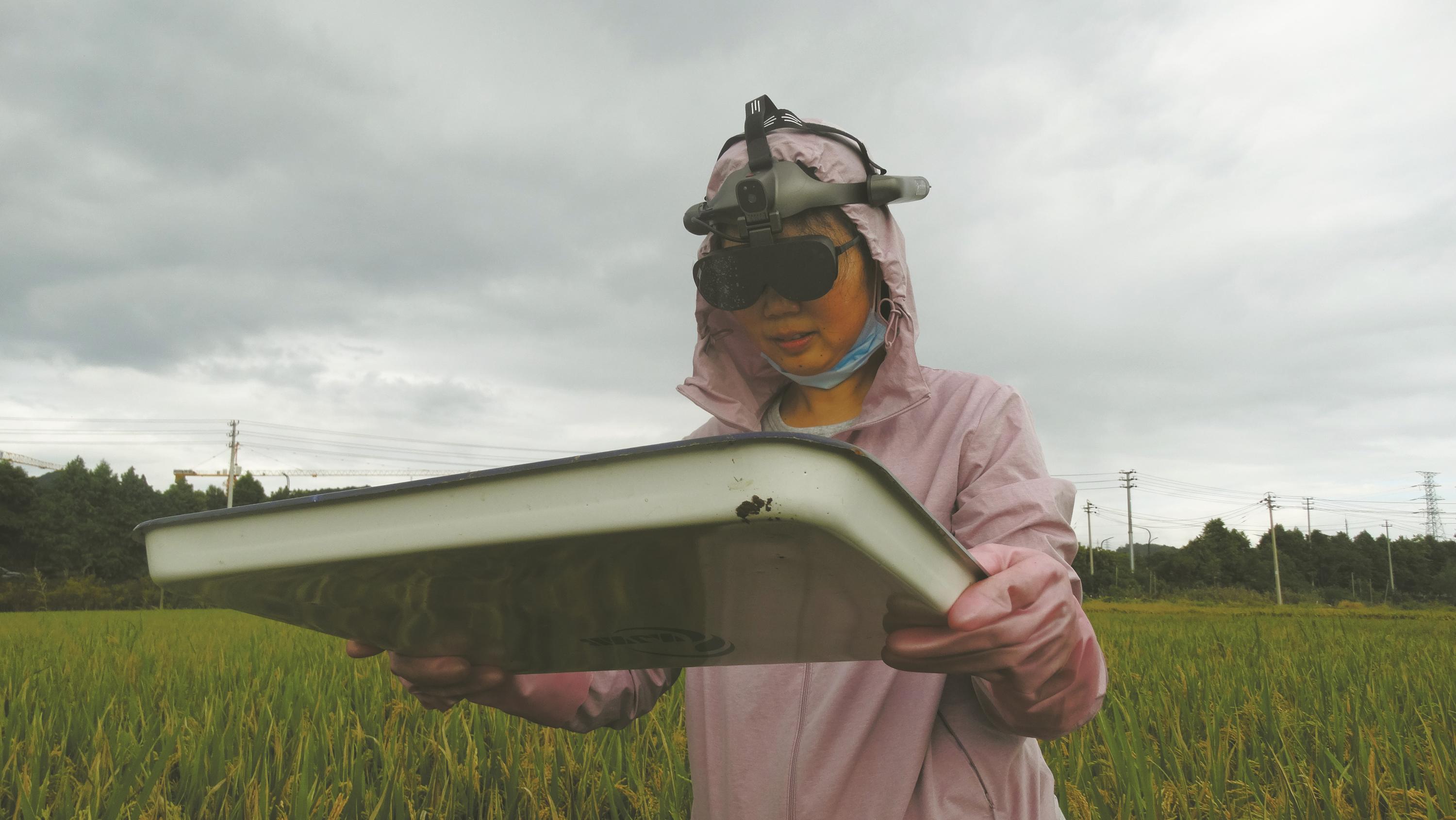 10月20日,宁海县茶院镇下徐村的一处水稻农场迎来了一支植保小分队。植保员戴上AI眼镜,下到稻田开始查虫。只见他用查虫瓷盘采集一批虫子,随后用AI眼镜对着瓷盘扫描识别:“本次共查到27只虫子,其中稻飞虱4只,其余为无害虫……”