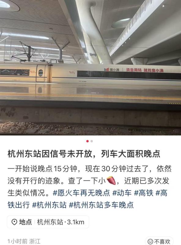 10月23日中午,有网友发帖称,杭州东站因信号未开放,列车大面积晚点。