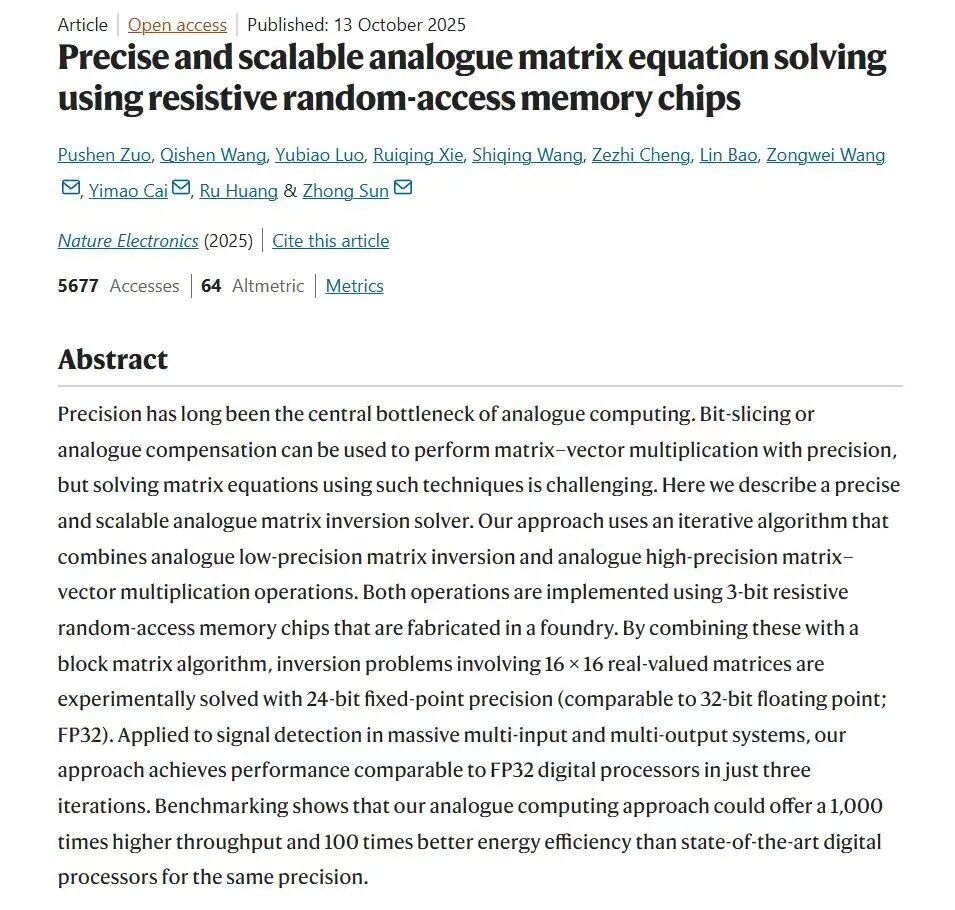 近日,北京大学人工智能研究院孙仲研究员团队联合集成电路学院研究团队,成功研制出基于阻变存储器的高精度、可扩展模拟矩阵计算芯片,首次实现了在精度上可与数字计算媲美的模拟计算系统。