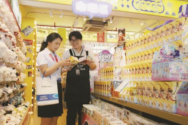 甬城农商行客户经理向潮玩店介绍金融支持小微企业的政策。