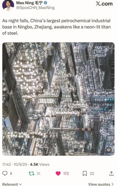 近日,外交部发言人毛宁在海外社交平台X(原推特)上点赞并转发了一则展现浙江宁波镇海炼化夜景的航拍视频,并配文赞叹:“夜幕下的浙江宁波镇海炼化灯火璀璨,犹如钢铁巨人苏醒。”