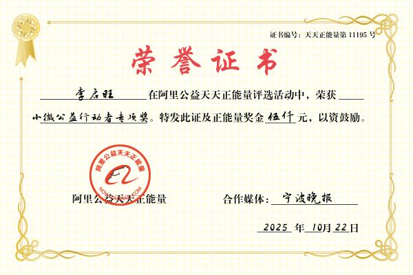 这份默默的坚守,在10月23日这天,迎来温暖回应:宁波晚报联合阿里巴巴“天天正能量”授予他“小微公益行动者专项奖”,为他颁发5000元奖金。