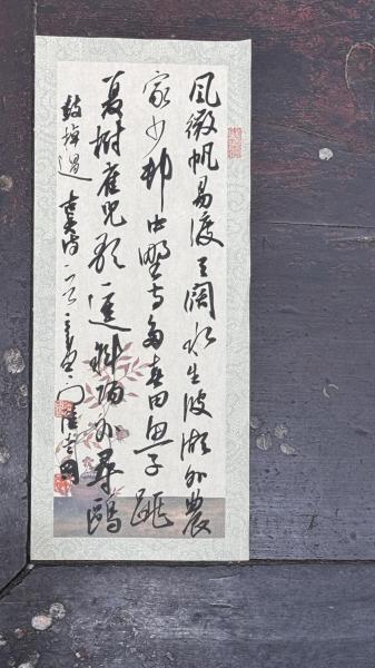 内容:“风微帆易渡,天阔水生波。湖外农家少,村中野寺多。春田鱼子跳,夏树雀儿歌。一径斜阳外,寻鸥鼓棹过”,落款:“古贤诗一首,三合堂主人陆爱国”。