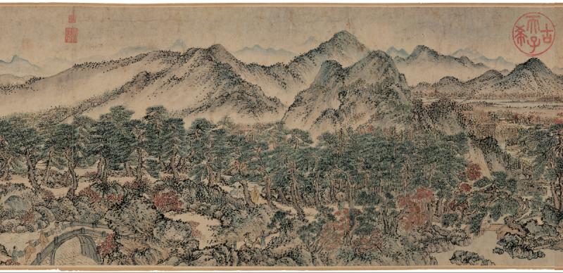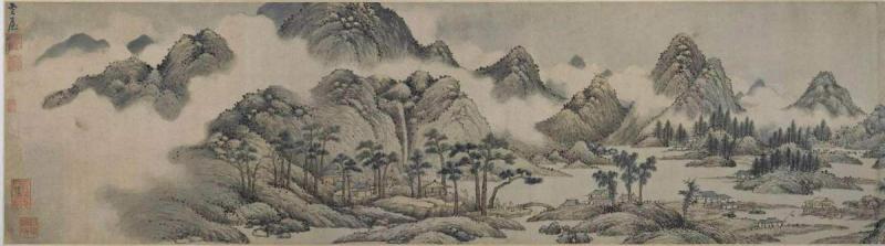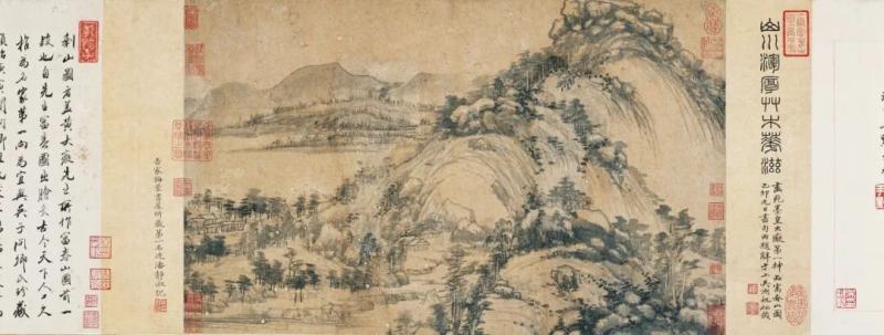 横幅长卷,尽写富春江两岸秀丽的山光水色。峰峦坡石随势起伏,山涧深处清泉飞泻,茅屋村舍参差其间,渔舟小桥错落有致,人随景迁、景随人移。勾勒、皴擦、点染,技法高超,有“画中兰亭”之誉。