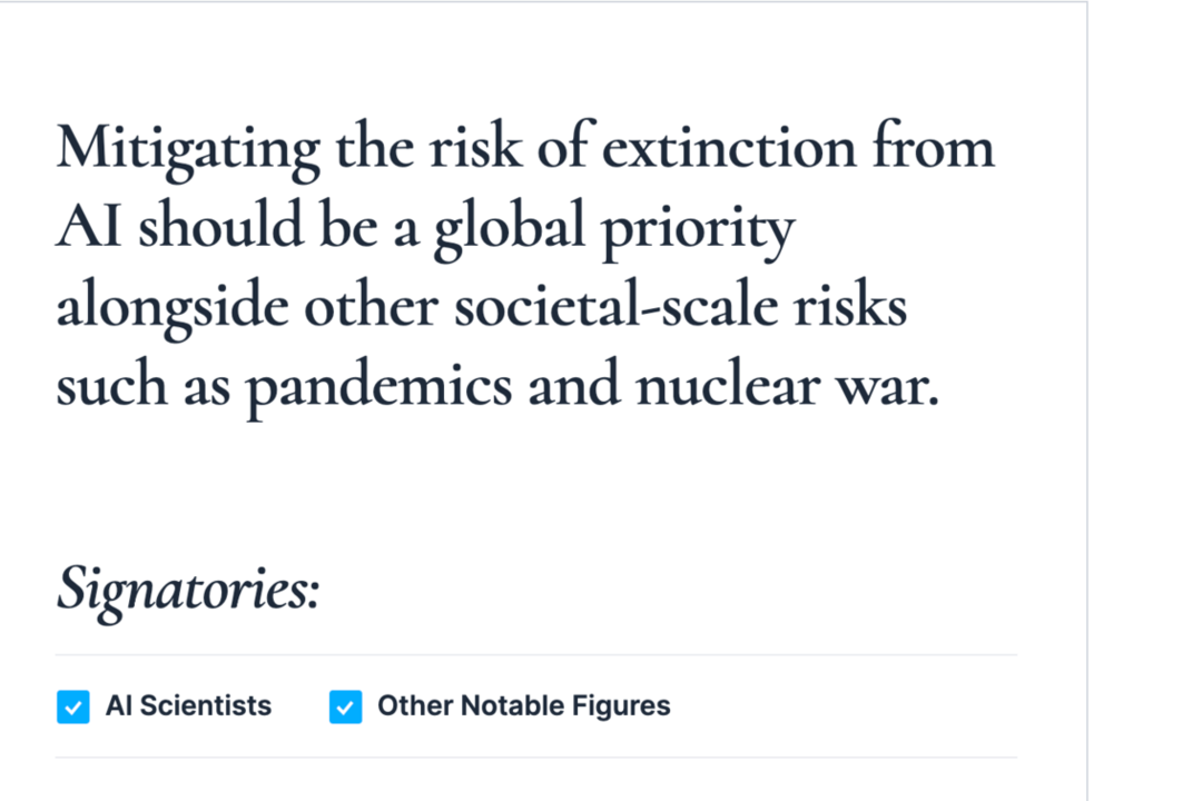 人工智能爆发元年也就是2023年,非营利组织“人工智能安全中心”(Center for AI Safety)也曾发布声明,这份仅有22个英文单词的简短声明称,降低AI可能带来的灭绝风险,应与流行病和核战争等一样成为全球首要任务。当时OpenAI首席执行官山姆、人工智能先驱杰弗里·辛顿、微软首席技术官凯文·斯科特等数百名AI行业的领军人物、学者等共同签署了这份声明。