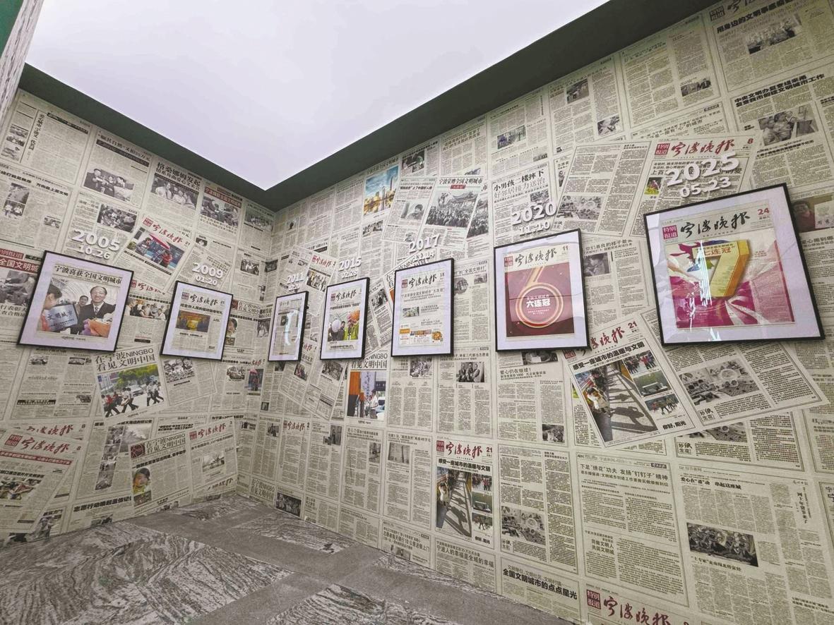 “文明印迹·宁波20年”城市巡回微展的报纸墙。